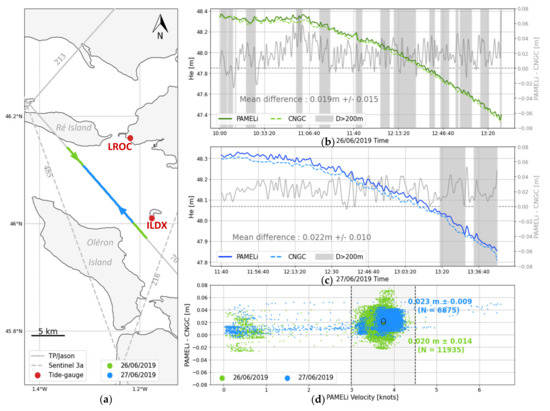 The June 2019 experiment in Les Pertuis Charentais area was designed to compare CalNaGeo towed carpet sea surface measurements with Mini-Cyclopée mounted on PAMELi. On two consecutive days (26 and 27 June 2019), the two systems mapped SSH under trace 70 of the Jason 3 altimetric mission. During these two days, CalNaGeo and PAMELi USV covered the 15 km track at an average speed of 3.5 knot and with a mean spacing of 190 m (Figure 10a). The mission was carried out during a neap tide period with calm weather and sea conditions.
