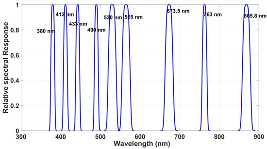 The relative spectral response of the global change observation mission-climate (GCOM-C) visible and near-infrared (VNIR) channels. The spectral response data were obtained from the GCOM-C official portal (https://suzaku.eorc.jaxa.jp/GCOM_C/instruments/files/sgli_rsr_f_for_algorithm_201008.txt).