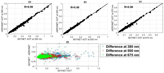 (top panel) Comparison between sky radiometer network (SKYNET) and aerosol robotic network (AERONET) aerosol optical thickness (AOT values) at (a) 380, (b) 500, and (c) 675 nm. The data with cloud flag 0 in both datasets were plotted. The solid black lines in (a–c) indicate the 1:1 line. (bottom panel) (d) The difference between the SKYNET and AERONET AOT values at 380, 500, and 675 nm was plotted as a function of the SKYNET AOT values at the respective wavelengths.