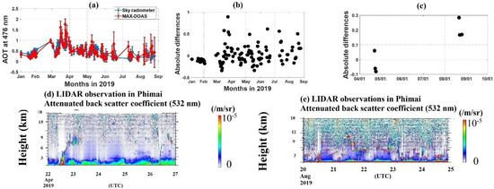 Coincident AERONET observations were not available for the Phimai site. Thus, the sky radiometer AOT values in Phimai were compared with the aerosol dataset from coincident MAX-DOAS observations. Figure 3 shows the AOT at 476 nm retrieved from the sky radiometer and MAX-DOAS observations in Phimai. The sky radiometer AOT values at 500 nm were converted to those at 476 nm using the sky radiometer Angstrom exponent (AE) data. Coincident days with at least four observations were selected. The statistics of the comparison are shown in Table 7. The sky radiometer and MAX-DOAS AOT values at 476 nm showed good agreement with an R-value of 0.73. In some cases, larger differences were observed between the sky radiometer and MAX-DOAS values at 476 nm. The integration times of the two instruments differed. It was unlikely that the difference in integration time was the dominant factor driving the differences in the AOT values. Another possible cause was the impact of clouds. An example case using LIDAR observations in Phimai is shown in Figure 3. Figure 3d,e show coincident LIDAR measurements in Phimai for some selected days in April and August 2019. On April 23, 24, and 25, the attenuated backscatter coefficient was low, indicating clear sky conditions. On August 21 and 22, clouds (high backscatter coefficient) were observed. The differences in the AOT values on these days are shown in Figure 3c. On clear sky days, the differences in the AOT values were lower. When clouds were present, the differences in the two observations were greater, especially for low-altitude clouds. Thus, differences could occur if clouds were not properly screened. Despite these differences, sky radiometer and MAX-DOAS observations at both sites showed good agreement under clear sky conditions.