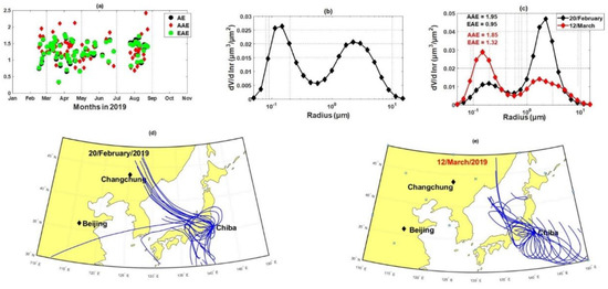 (top panel) (a) The Angstrom exponent (AE), absorption Angstrom exponent (AAE), and extinction Angstrom exponent (EAE) values in Chiba for the observation period. The AAE and EAE values were calculated using Equations (1) and (2). (b) The mean aerosol volume size distribution for the observation period. The volume size distribution data from the coincident AERONET observations were used. Only the coincident days between the SKYNET and AERONET observations were used in the calculation. (c) The aerosol volume size distribution for 20 February and 12 March. The days were selected based on AAE values. (bottom panel) (d) 48 h backward trajectories, starting from 200 m above ground level over the Chiba site on February 20, 2019. (e) Similar 48 h backward trajectory on 12 March 2019.