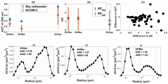 (top panel) (a) The sky radiometer and GCOM-C AOT at 380 in Chiba on March 2 and 4 and April 5. The coincident days were selected based on the AAE, EAE, and volume size distribution data. (b) The corresponding sky radiometer and GCOM-C AE values on March 2 and 4 and April 5. The sky radiometer and GCOM-C AE are denoted as AEsky and AEsat, respectively. (c) The difference between the sky radiometer and GCOM-C AOT was plotted as a function of differences in AEsky and AEsatt. (bottom panel) The aerosol volume size distribution from the coincident AERONET observations in Chiba on (d) April 5, (e) 4 March, and (f) March 2. The example days were chosen based on the AAE and EAE values.