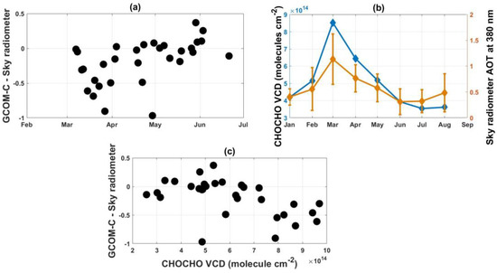 (top panel) (a) The time series of the difference between the GCOM-C and sky radiometer AOT at 380 nm in Phimai. (b) The seasonal variation of the glyoxal (CHOCHO) vertical column density (VCD)and the sky radiometer AOT values at 380 nm. The CHOCHO VCDs were retrieved from the MAX-DOAS observations using the JM2 algorithm. The error bars show the 1σ standard deviation of the mean values. (bottom panel) (c) The difference between coincidence GCOM-C and sky radiometer at 380 nm plotted as a function of CHOCHO VCD values. CHOCHO VCD values for the day prior to the coincident date between MAX-DOAS, sky radiometer, and GCOM-C were plotted.