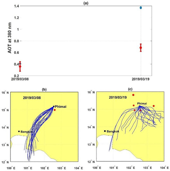 (a) The sky radiometer and GCOM-C AOT values at 380 nm in Phimai on March 8 and 19. The error bars indicate the 1σ standard deviation. 24 h backward trajectories, starting from 200 m above ground level over the Phimai site on (b) March 8 and (c) March 19, 2019. The red dots indicate the fire activities within 100 km of the Phimai site.