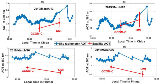 (top panel) The diurnal variation in the AOT at 380 inferred from the sky radiometer and combination of GCOM-C and ozone monitoring instrument (OMI) AOT values in Chiba on (a) 13 March and (b) 20 March. The sky radiometer data within 20 min of GCOM-C (10:20 LT) and OMI (13:30) overpass time were used. The coincidence criterion for both satellite dataset was within 20 km of the Chiba site. (bottom panel) The diurnal variation in AOT at 380 nm observed from the sky radiometer and combined satellite (GCOM-C plus OMI) observations in Phimai on (c) 20 March and (d) 27 March. The data selection criterion for the sky radiometer and satellites was similar to that for Chiba. The error bars in (a–d) indicate the 1σ standard deviation.