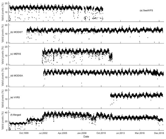 The percentage of valid pixels of daily Chl-a imagery for each satellite (a–e) and the data merged from five satellites (f).