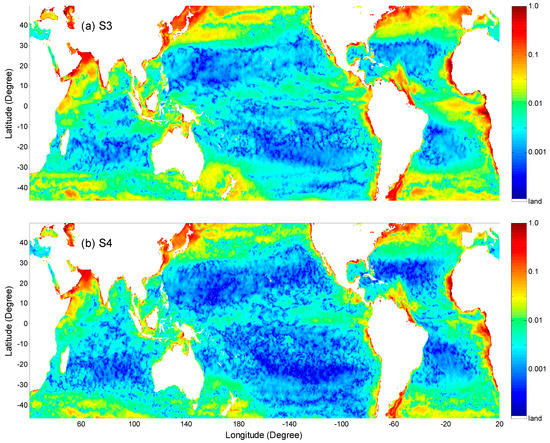 Comparing Figure 3 to Figure 2, the patterns of amplitudes are different from that of the mean image. The regional patterns of the five subtropical gyres become complicated in the images of the amplitudes, indicating that the seasonality of Chl-a is different among these gyres and varies in a relatively complicated way. Combining Figure 2 and Figure 3, the images of amplitudes offer a way to distinguish the seasonal variations from the background of Chl-a in different regions. When Equation (3) is used to fit the daily climatology, the amplitudes of S3 and S4 are obtained, as shown in Figure 4. S3 and S4 represent seasonal variations of components with a period of four and three months.