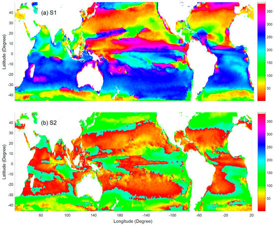 Comparing images between phase and amplitude, values of amplitudes in the coastal regions are higher than other regions, while spatial patterns of four phases are seldom affected by the coastal waters. The image patterns of S1 phase are similar to the results of phenological timing of Racault et al. [43]. As the phase values are determined on the zero 1 values when the sinusoid crosses from negative to positive, indicating the phases can be used to determine the timing of bloom onset.