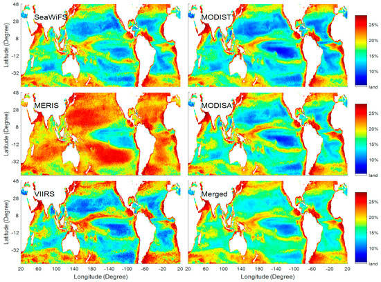 From Figure 1, the daily percentages of valid pixels of each satellite exhibit seasonal changes which are mainly due to seasonal variability of the coverage of the incident solar irradiance on the sea surface. The numbers of valid satellite-retrieved Chl-a are also affected by the satellite swath, data processing algorithms, the cloud coverage, thick aerosols, sun glint, and other factors. The percentage of valid pixels of each satellite ranges from 10% to 20% with the average of 14.5% (SeaWiFS), 15.4% (MODISA), 13.8% (MODIST), 13.8% (MERIS), and 14.0% (VIIRS), respectively. The valid pixel coverage of Chl-a images of Level 3 products between MERIS and MODIS are similar, even though there is a large difference of satellite swath between about 1000 km of MERIS and about 2000 km of MODIS.