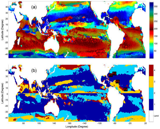 (a) The bloom period identified as the peak of the largest bloom using the fitted values of Equation (3) in the unit of day of year. (b) The regions of bloom timing classified into four seasons of boreal winter (December–February, marked as Class 1), boreal spring (March–May, Class 2), boreal summer (June–August, Class 3), and boreal autumn (September–November, Class 4) for the Northern Hemisphere, and austral winter (June–August, Class 1), austral spring (September–November, Class 2), austral summer (December–February, Class 3), and austral autumn (March–May, Class 4) for the Southern Hemisphere. Four sites (P1–P4) in Figure 12b are selected from corresponding seasons of bloom.