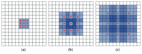 Figure 5b, respectively, represent the receptive fields obtained by ordinary convolutions and dilated convolutions after three convolution operations. It can be clearly seen from the figures that by using dilated convolutions, the information contained in the same parameter (red circle) is about 3.8 times that of ordinary convolutions (blue circle) in the feature map. Thus, it can be seen that by using dilated convolutions, the same parameter in the network can contain more surrounding information, and the building deviation caused by different viewing angles of sensors can be solved by a more friendly way.