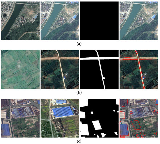 A dataset was created to train and verify the validity of the proposed model. Compared with other published datasets, the dataset used in this work contains more details of the objects and their environments due to a lower view altitude. Therefore, the requirements for the algorithm are higher. This dataset contains 3420 pairs of Google Earth images, the size of each image is 512 × 512, and the corresponding area is approximately 300 square meters. These images from Google Earth (GE) include shots taken at different times from 2010 to 2019. GE is a virtual earth software developed by Google, which allows users to browse high-definition images of different time periods around the world for free. The satellite image of GE is not a single data source, but an integration of multiple satellite images, mainly from DigitalGlobe’s QuickBird commercial satellite and EarthSat (images mostly from landsat-7). GE has a resolution of at least 100 m, usually 30 m. The view altitude is ~15 km. However, for big cities, famous scenic spots, or other hot spots, high-precision images with a resolution of 1 m or 0.6 m will be provided, with the viewing altitude of approximately 500 m or 350 m, respectively. The images of these places have been contained in the dataset. When collecting data, the bitemporal Google Earth images have been registered. The dataset has the following characteristics. (1) The proportion of positive to negative samples varies greatly. There are only small parts of changed areas in a complete Google Earth image. (2) The buildings in the images have some positional deviations due to different shooting angles. (3) Numerous scenes in changed areas, including farmland, roads, high-speed rail, factories, buildings, and mining areas. (4) Seasonal factors have great influence. For example, deciduous broad-leaved forests with seasonal changes have significant differences in winter and summer. (5) In order to obtain the most accurate changed area information, all ground truth were marked manually.