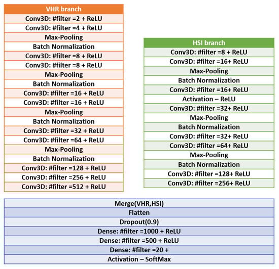 Due to the fact that CNNs require a considerable amount of data in order to ensure that sufficient generalization is achieved during training, the following preprocessing steps are applied in our dataset before going ahead with any learning or classification. Firstly, the four separate VHR-RGB tiles had to be merged, as well as resized along with the HSI image, to match the spatial size of the ground truth data. Then, image patches of size 25 × 25 pixels were cropped out by sliding through each training image. The generated patches contain the same pixels from both images, in order to get complementary information. Furthermore, for each class, we randomly chose 400 distinct patches from each image with a selected pixel as a starting point, resulting in overall 8000 (8 K) patches. The proposed processing pipeline is depicted in Figure 1 while the specific parameters of the network are shown in Figure 2.