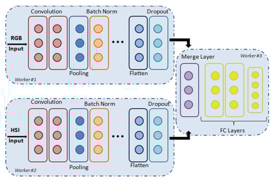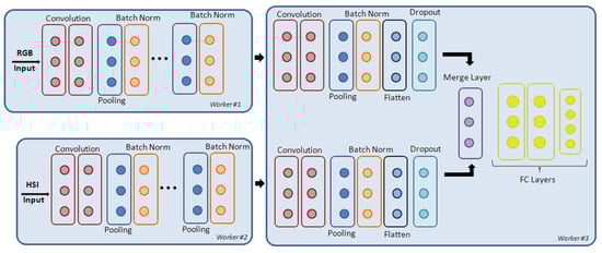 The baseline architecture of proposed distributed multimodal CNN consists of three main parts, each assigned to a different worker: The VHR-RGB part at the top branch, the HSI part at the bottom branch and merging part that leads to classification output is shown on the right.