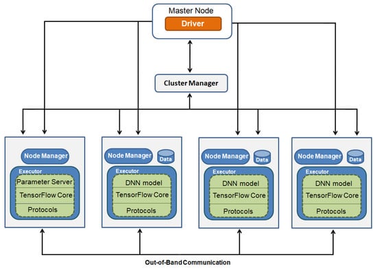TFoS exploits Spark’s native mechanisms for automatic cluster configuration while bypassing its communication philosophy, thereby allowing for direct tensor communication between TF processes. This framework also implements the concept of Parameter Server (PS) [] for enabling the smooth integration of TensorFlow code over Spark clusters, with minimum changes on the original TensorFlow code. In a data parallelization approach, PS is responsible for providing a global average of network parameters, while the rest of the nodes are responsible for training, whereas in a model parallelization approach PS is responsible for distributing parts of a model to the nodes as well as acting as a training coordinator between the nodes.