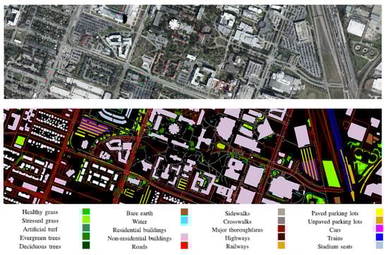 Specifically, the HSI observations were acquired by a ITRES CASI 1500 sensor, covering a 380–1050 nm spectral range with 48 bands at a 1-m GSD. The observations were orthorectified and radiometrically calibrated to units of spectral radiance. The VHR-RGB observations were acquired by a DiMAC ULTRA-LIGHT+ camera with a 70-mm focal length and post-acquisition processed through white balance, calibration with respect to plane instruments, and orthorectified. The entire image is organized into four separate tiles, resulting in an image of size 12,020 × 47,680 pixel, when concatenated. A Ground truth image presented in Figure 7 was also provided as raster at a 0.5 m GSD, and it is corresponding to 20 urban land use and land cover classes, listed in Table 1. This dataset was developed in the context of the 2018 IEEE GRSS Data Fusion Contest “Advanced multi-sensor optical remote sensing for urban land use and land cover classification” [].
