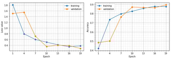 Training and validation set (left) loss function value, (right) overall accuracy.