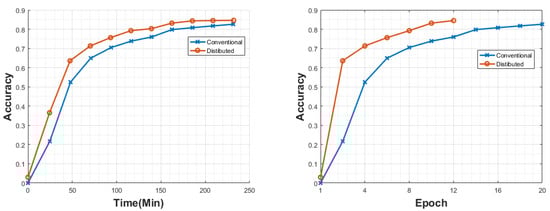 The results demonstrate the advantage of the distributed architecture in terms of training accuracy, in contrast to the conventional single-processing-unit approach. Specifically, while both implementations achieve comparable accuracy, the distributed training architecture attains higher accuracy in less time as shown in Figure 9 right. Furthermore, for the same amount of time, the distributed processing scheme achieves comparable accuracy to the conventional scheme from a smaller number of epochs as shown in Figure 9 right. The reason while the distributed scheme completes a smaller number of epochs compared to the single-processing-unit is that in addition to processing, the distributed processing scheme must also accommodate communication transfer delays.As a result, a large part of the gains achieved by the distributed allocation of resources are lost due to communications overheads. We note that in both cases, the processing units are CPU which is not optimized for CNN training and therefore, significantly higher gains could potentially be achieved if GPUs were used.