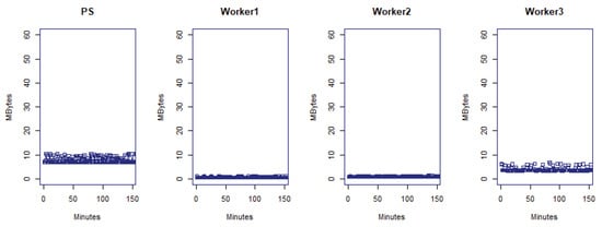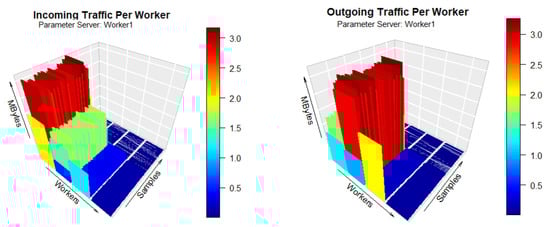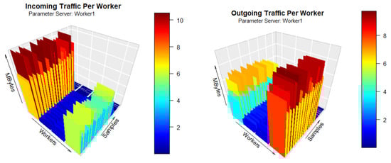 Regarding the network traffic, Figure 14 and Figure 15 demonstrate that for the data parallelization scheme, a significant amount of traffic is associated with PS since its is primarily responsible for synchronizing the different workers, while all workers exhibit similar network traffic characteristics. On the other hand, for the proposed model parallelization scheme, the traffic associated with PS is significantly lower compared to the data parallelization scheme, at the same level as the other workers. Furthermore, worker #3, the one associated with the fusion, and thus the majority of the fully connected layers, has higher network traffic compared to the other workers, nevertheless, it is still less compared to the traffic for the data parallelization scheme.