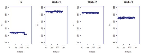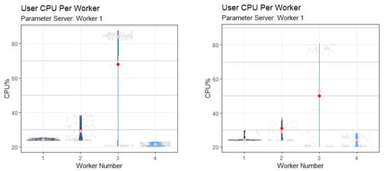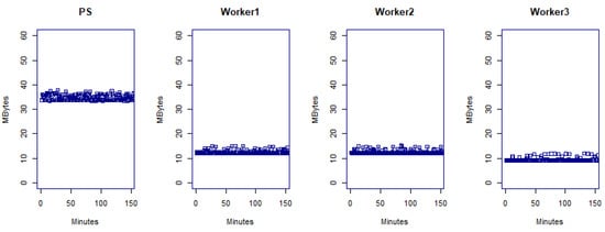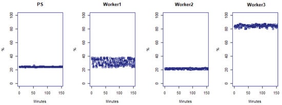 Regarding the CPU load for the data and model parallelism schemes shown in Figure 16 and Figure 17, a first observation is that in both data and model parallelism scheme, the PS worker is associated with the lowest CPU load, although based on the previous discussion, it is associated with the bulk of the network traffic. As expected, for the case of data parallelism, all three workers exhibit the same CPU load, which is in the order to 90% percent. On the other hand, the majority of processing for the model parallelism scheme is associated with worker #3, the one responsible for the feature fusion and classification using fully connected layers.