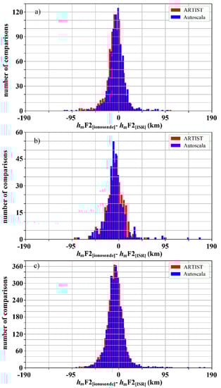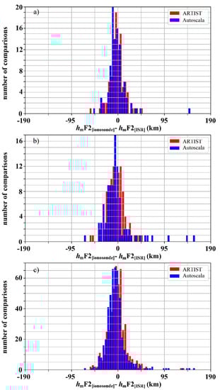 Histograms of the differences hmF2[Autoscala] − hmF2[ISR] (in blue) and hmF2[ARTIST] − hmF2[ISR] (in red) under high magnetic activity, during daytime (between 10:00 and 14:00 LT) (a), nighttime (between 22:00 and 02:00 LT) (b), and for the day as a whole (c). Each histogram class includes differences over a 5 km-wide interval. Conditions are classed as strongly disturbed if a magnetic index value ap > 40 was observed over the previous 24 h.