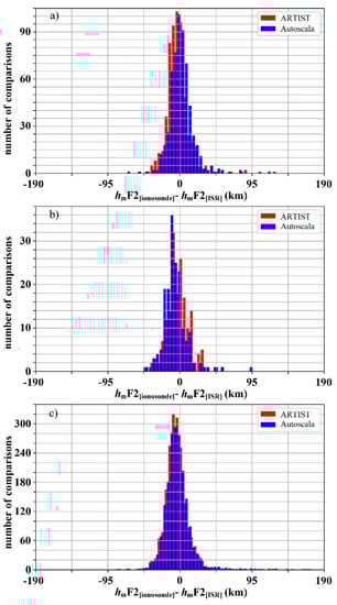 Histograms of the differences hmF2[Autoscala] − hmF2[ISR] (in blue) and hmF2[ARTIST] − hmF2[ISR] (in red) under moderately disturbed conditions, at daytime hours (between 10:00 and 14:00 LT) (a), at nighttime (between 22:00 and 02:00 LT) (b), and for the day as a whole (c). Each histogram class includes differences over a 5 km-wide interval. Conditions are classed as moderately disturbed if a magnetic index value 7 < ap ≤ 40 was observed over the previous 24 h.