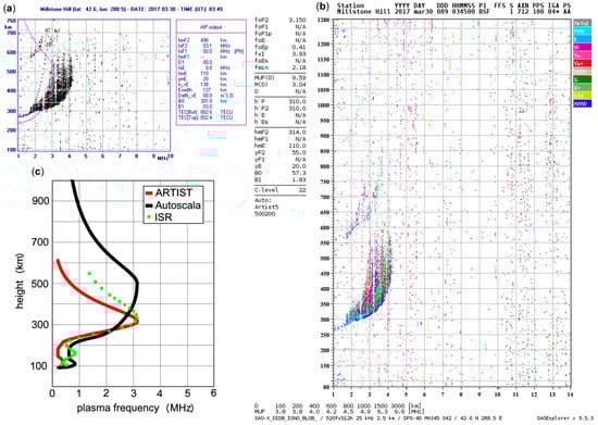 Nighttime ionogram recorded at Millstone Hill (42.6°N, 288.5°E) at 3:45 UT (22:45 LT) on March 30 2017, under high magnetic activity. (a) reports the standard output of the Autoscala program, with Ne(h)[Autoscala] shown in magenta and the restored trace in blue. (b) shows the standard output of the ARTIST program. (c) illustrates Ne(h)[Autoscala] (in black), Ne(h)[ARTIST] (in red), and Ne(h)[ISR] data (in green). In this case, hmF2[Autoscala] = 498 km (a), and hmF2[ARTIST] = 314 km (b), while hmF2[ISR] = 335 km. Hence, the ARTIST system overestimated the hmF2 height by 21 km, while Autoscala overestimated it by 163 km.