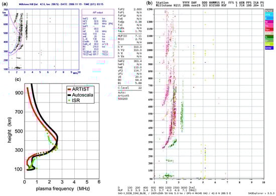 Under high magnetic activity ARTIST shows better accuracy than Autoscala, as demonstrated by RMSE[ARTIST] < RMSE[Autoscala], in both nighttime and daytime conditions, and considering all hours of the day. Besides, the behavior of Autoscala during nighttime is particularly critical, due to high magnetic activity. Despite the very low mean underestimations of hmF2[Autoscala] compared to hmF2[ISR] (Δ[Autoscala] = −1.57 km), clearly in these circumstances RMSE[Autoscala] (equal to 34.06 km) is much higher than at other times. Under these conditions, there are also 7.37% of cases in which hmF2[Autoscala] − hmF2[ISR] > 40 km, while for ARTIST (RMSE[ARTIST] = 19.52 km) the percentage is only 2.11%. Examples of such cases are shown in Figure 4a,b and Figure 5a,b, while Figure 4c and Figure 5c report the corresponding comparisons between the Ne(h) values provided by Autoscala, ARTIST, and from ISR data. These critical cases included some in which the trace was difficult to locate because of Spread-F conditions (see e.g., [,]) and Autoscala fails to correctly detect the trace (see Figure 4a,b). Conversely, in other critical cases the trace appears to have been correctly detected by both programs (see Figure 5a,b), and the greater accuracy achieved by ARTIST is probably linked to its more efficient estimation of the F-region semi-thickness parameter B0 (see e.g., []), which describes the profile in the F2 region. However, among the 7 cases in which hmF2[Autoscala] − hmF2[ISR] > 40 km, there are 2 in which hmF2[ARTIST] also overestimates hmF2[ISR] by over 40 km.