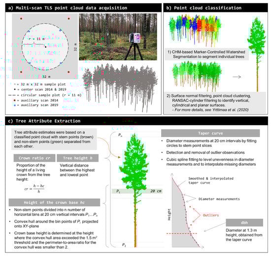 Outline of the terrestrial laser scanning (TLS) data processing workflow. (a) One center scan and four auxiliary scans were used to acquire a multi-scan TLS point cloud data in 2014 and 2019. (b) TLS-based canopy height model (CHM) and a Marker-Controlled Watershed Segmentation procedure was applied to normalized TLS point clouds to detect individual trees. Surface normal filtering, point cloud clustering, and Random Sample Consensus (RANSAC)-based cylinder filtering were applied to identify vertical, cylindrical, and planar surfaces to classify TLS point cloud into stem and non-stem points (for more details, see [39]). (c) Then, the classified point cloud was used to extract tree attributes, namely diameter-at-breast-height (dbh) and tree height (h) for all the trees, and height of the crown base (hc) and crown ratio (cr) for Scots pine (Pinus sylvestris L.) trees.