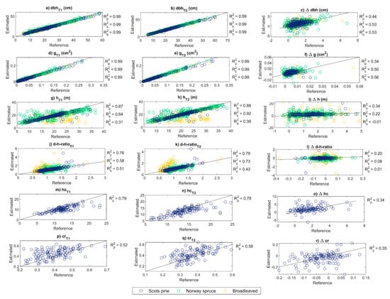 Relationship between the field-measured reference measurements and the TLS-derived estimates on tree attributes, such as diameter-at-breast-height (dbh), basal area (g), tree height (h), diameter-height-ratio (d-h-ratio), and crown ratio (cr) by tree species measured in 2014 (T1) and 2019 (T2) as well as their difference (Δdbh, Δg, Δh, Δd-h-ratio, and Δcr). The solid black line represents the 1:1 relationship between the reference and the estimated values. R2p, R2s, and R2b denote coefficient of determination for Scots pine, Norway spruce, and broadleaved trees, respectively.