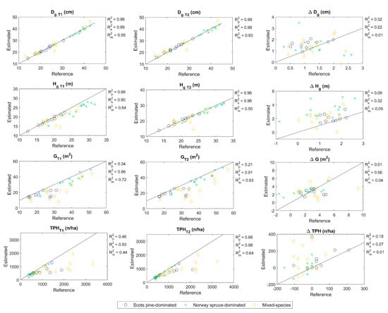 Relationship between the field-measured reference measurements and the TLS-derived estimates on forest structural attributes, such as basal area-weighted mean diameter (Dg) and -height (Hg), mean basal area (G), and number of trees per hectare (TPH) by main tree species in 2014 (T1) and 2019 (T2) as well as their difference (ΔDg, ΔHg, ΔG, and ΔTPH). The solid black line represents the 1:1 relationship between the reference and the estimated values. R2p, R2s, and R2b denote coefficient of determination for Scots pine-dominated, Norway spruce-dominated, and mixed-species forest plots, respectively.