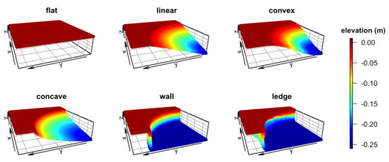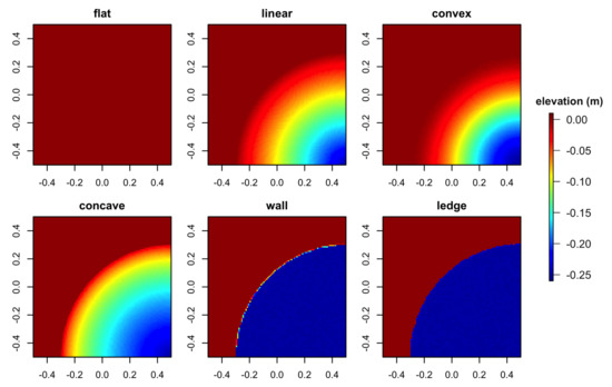 Simulated surface models were generated as 3D mesh models using Blender v.2.80 (Blender Foundation, Amsterdam, The Netherlands). Each model was created to have a 2D planar area of 1 × 1 m, with vertices being spaced at an approximately 0.8-cm interval, and all faces were triangulated. Blender’s proportional editing function was used with “random” falloff that was set to 0.01 m in the z (vertical) direction so that slight surface roughness was added to replicate bare reef substrata. The models imitated the following six surface structures: flat, linear slope (linear), upward convexity (convex), upward concavity (concave), vertical wall (wall) and overhanging ledge. We chose these six surface structures to examine the structural complexity of reef substrata and to compare different types of sloping surfaces with a flat surface. The wall and overhanging ledge structures were included because such structures are common in coral-reef habitats, and the sudden changes in depth that are associated with these structures would likely contrast with the gradual changes in depth associated with sloping surfaces. Comparisons between the wall and overhanging ledge structures were also of interest, as these two structures should have minimal differences in their DEMs when captured from the overhead angle, but not in their 3D mesh models, which can capture the area under an overhang. For all models, the maximum difference in z-values was set to ≈0.25 m (Figure 1).