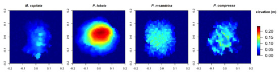 Digital Elevation Models obtained from the four reconstructed coral colonies with different morphologies: encrusting M. capitata, mounding P. lobata, branching P. meandrina and branching P. compressa.
