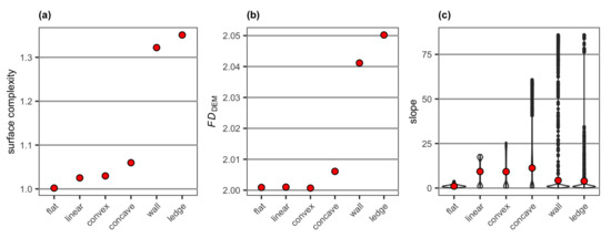 The range of slope values extracted from the DEMs of the six simulated surface structures increased from the flat surface to the linear surface, convex, concave and the wall and overhanging ledge structures (Figure 7c). The mean of slope values was, however, the highest with the concave followed by the convex and linear surface (Figure 7c). Slope was steeper for the concave than the convex at the edge where the elevation started dropping from 0 m (Figure 1), and this produced more extreme values for the concave than the convex and resulted in the higher mean value (Figure 7c). The linear surface had two clumps, one close to 0 degrees for the flat part of the surface and the other one near 18 degrees for the consistently sloping (i.e., linear) surface (Figure 7c). While the wall and overhanging ledge structures contained higher slope values than all other surface types, most areas of these structures were flat (i.e., both at the top and the bottom of the wall/ledge), resulting in the lower mean slope values than the three sloping surfaces (Figure 7c).