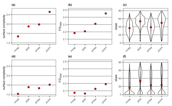 Values of (a) surface complexity and (b) FDDEM and a violin plot for (c) slope extracted from the DEMs of the four reconstructed coral colonies with different morphologies, and values of (d) surface complexity and (e) FDDEM and a violin plot for (f) slope extracted from DEMs of the four reconstructed coral colonies with different morphologies with a substratum: mcap = encrusting M. capitata, plob = mounding P. lobata, pmea = branching P. meandrina and pcom = branching P. compressa. Note surface complexity and FDDEM generate a single value per DEM, while slope is generated for each cell of a DEM. The mean value of slope for each colony is shown as red points.