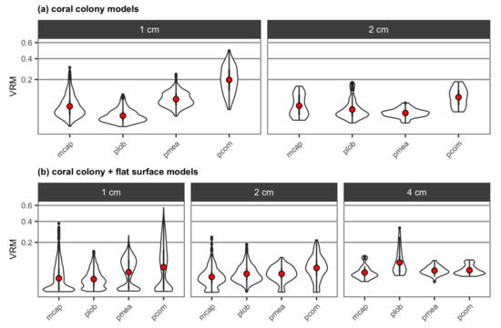 Violin plots for (a) VRM extracted at two different resolutions, 1 cm and 2 cm, from the DEMs of the four reconstructed coral colonies with different morphologies, and (b) VRM extracted at three different resolutions, 1 cm, 2 cm and 4 cm, from the DEMs of the four reconstructed colonies with different morphologies with a substratum: mcap = encrusting M. capitata, plob = mounding P. lobata, pmea = branching P. meandrina and pcom = branching P. compressa. The mean value of VRM for each colony is shown as red points. The coral colonies were too small to obtain VRM at 4-cm resolution.