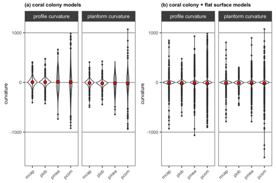 Violin plots for profile curvature and planform curvature extracted from the DEMs of (a) the four reconstructed coral colonies with different morphologies and (b) the four reconstructed coral colonies with different morphologies with a substratum: mcap = encrusting M. capitata, plob = mounding P. lobata, pmea = branching P. meandrina and pcom = branching P. compressa. The mean value of curvature for each colony is shown as red points.
