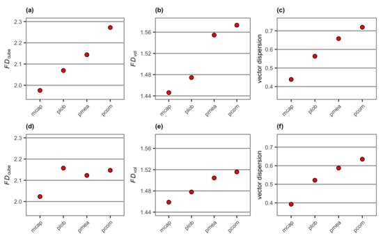 Values of (a) FDcube, (b) FDvol and (c) vector dispersion extracted from the 3D mesh models of the four reconstructed coral colonies with different morphologies, and (d) FDcube, (e) FDvol and (f) vector dispersion extracted from the 3D mesh models of the four reconstructed coral colonies with different morphologies with a substratum: mcap = encrusting M. capitata, plob = mounding P. lobata, pmea = branching P. meandrina and pcom = branching P. compressa.