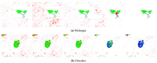 In terms of false negatives (FNs) and false positives (FPs), the probabilistic method (rR) [17] provided the worst performance. This was because the assumption of a large difference between pre-event and post-event images was not true in some of the test scenarios. The KI [16] and rrR-EM [18] algorithms classified all pixels in the San Francisco and California scenarios as belonging to the change category, producing zero FN and very high FP rates. In summary, the U-CD-HPT [31] and GBF-CD methods provide a reasonable compromise between the correctly detected change pixels, FNs, and FP rates (see Table 5, Table 6, Table 7, Table 8, Table 9, Table 10, Table 11, Table 12, Table 13, Table 14, Table 15, Table 16, Table 17 and Table 18, where the best performance with respect to the metrics is written in bold type).