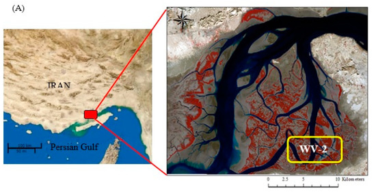 Technical specifications of the Worldview-2 and Sentinel-2 imagery are given in Table 2. Images were cloud-free over coastal areas. The multispectral bands of Worldview-2 consist of four standard bands (red, green, blue and near-infrared 1) and four additional bands (coastal, yellow, red edge and near-infrared 2), which facilitated spatial and spectral analysis, mapping and monitoring of large areas at a more detailed level [43]. Sentinel-2 bands consist of four bands at a 10-m spatial resolution (blue, green, red and near-infrared), six bands at a 20-m spatial resolution (four narrow bands near the red edge and two wider SWIR), and three bands at a 60-m spatial resolution (aerosols, water vapor and cirrus) [44]. The obtained data were pre-georeferenced to the UTM zone 40 North projection using the WGS-84 datum. Sentinel-2 data were radiometrically calibrated to apparent surface reflectance by the FLAASH (Fast Line-of-sight Atmospheric Analysis of Hypercubes) atmospheric corrected algorithm [45] in ENVI 5.4 software. Fusion of panchromatic with multispectral images of Worldview-2 data resulted in an image with a 0.5-m spatial resolution. In the present study, the Gram Schmidt pan-sharpening algorithm was applied [46] because it preserves the primary spectral value of the objects and has successfully been applied to multispectral images. In this study, a Sentinel-2 level 1C product image was applied, acquired on a clear day and under the lowest tide condition over Qeshm Island.