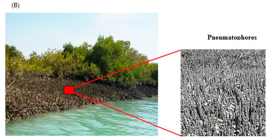 Mangrove forests are considered one of the most important ecosystems on the earth. They occur in the inter-tidal zones along coasts in most tropical and semi-tropical areas [1,2]. Despite the large ecological benefits of mangrove forests, such as carbon sequestration, protection of land from erosion, purification of coastal water quality, and maintenance of ecological balance and biodiversity, mangroves have been destroyed worldwide as a result of climate change and human activities [3,4,5,6].
