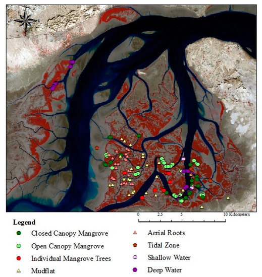 During the field survey, a total of 170 GPS reference points (Garmin 629sc with spatial accuracy between 1 and 5 m) were collected and used for validation of the classification of the eight land cover classes. In order to minimize and avoid the negative impacts on the vulnerable ecosystem, the collection of field samples was restricted to easily accessible parts. In order to increase the number of samples for three types of mangrove and two types of mudflat, 53 points were additionally selected from Spot 6/7 data using image interpretation. Figure 2 shows the distribution of the samples for the eight land cover classes. The set of reference points collected from both GPS and from the Spot images are depicted for each class separately in Table 1.