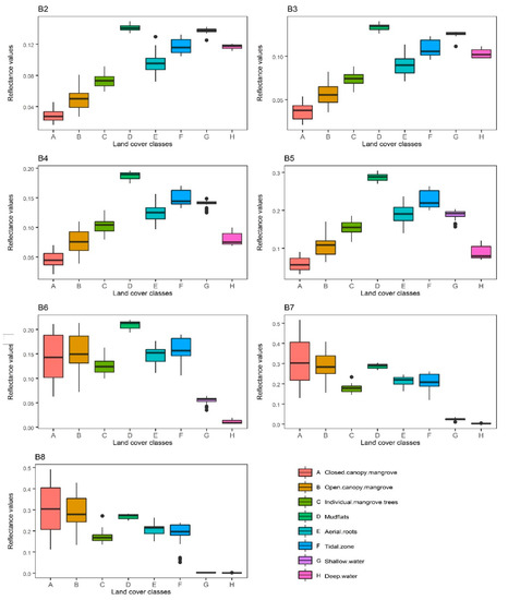 Reflectance values of the eight land cover classes for each Worldview-2 band: (B2) (Blue: 450–510 nm), (B3) (Green: 510–580 nm), (B4) (Yellow: 585–625 nm), (B5) (Red: 630–690 nm), (B6) (Red edge: 705–745 nm), (B7) (Near-infrared 1: 770–895 nm), and (B8) (Near-infrared 2: 860–1040 nm). The letters A to H show the land cover classes namely closed canopy mangrove, open canopy mangrove class, individual mangrove trees, mudflats, aerial roots, tidal zone, shallow water, and deep water, respectively.