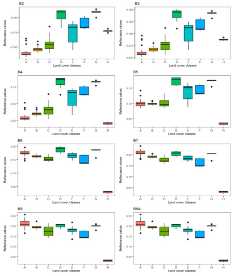 Reflectance values of the eight land cover classes for Sentinel-2: (B2) (Blue band 490 nm), (B3) (Green band 560 nm), (B4) (Red band 665 nm), (B5) (Vegetation Red Edge band 705 nm), (B6) (Vegetation Red Edge band 740 nm), (B7) (Vegetation Red Edge band 783 nm), (B8) (Near-infrared band 842 nm), and (B8A) (Vegetation Red Edge band 865 nm). The letters A to H show the land cover classes namely closed canopy mangrove, open canopy mangrove class, individual mangrove trees, mudflats, aerial roots, tidal zone, shallow water, and deep water, respectively.