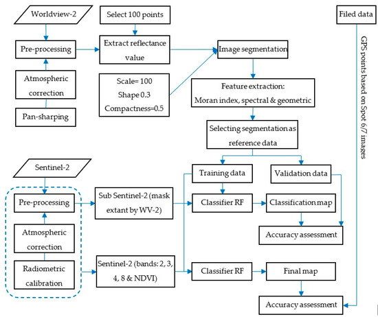 After the generation of the reference data, RF was used to classify Worldview-2 and Sentinel-2 images. In this step, Sentinel-2 imagery was preliminarily mapped over the same extent as the Worldview-2 image with 70% of the reference data. The accuracy of the map of the RF algorithm was then checked, and the reference data were used for mapping mangrove classes to a larger extent. A layer stack was created from the NDVI, blue, green, red and near-infrared bands. Sentinel-2 data (10 m spatial resolution) served as input for the RF classification. RF was performed using the Ranger Package in the R statistical software [55]. Figure 5 shows the main steps of the classification approach applied in this study.