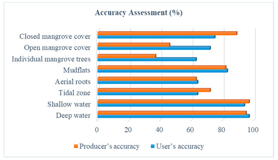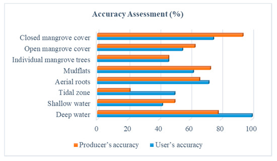 The classification revealed that the largest area (27,678 ha) belongs to the class deep water and smallest (62 ha) to the class individual mangrove trees. The classes closed canopy mangrove, open canopy mangrove, mudflat, aerial root and tidal zone cover an area of 4857, 3474, 13,099, 2296, and 2026 ha, respectively. The p-value of the Wilcoxon test for differences in the user’s and producer’s accuracies between the two classification maps were 0.11 and 0.32, respectively, which is greater than the significance level alpha = 0.05. We can conclude that the accuracy assessments did not differ significantly between the two classification maps.