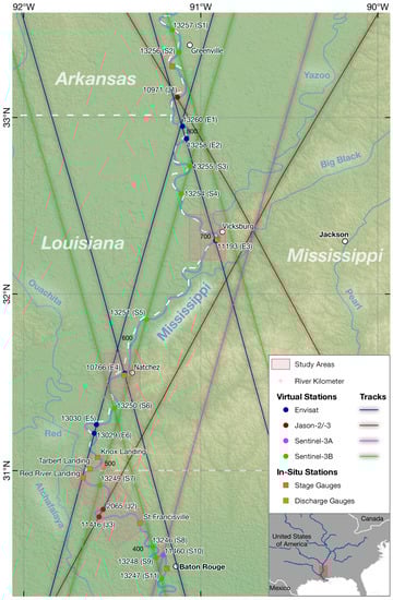 In situ discharge time series of the Mississippi River at Vicksburg, available from the USGS National Water Information System (NWIS) [], and at Natchez and Tarbert Landing, available from the USACE RiverGages.com website [] are used to validate the resulting discharge time series of this paper. Additionally, water level time series from the stage gauges at Greenville, Vicksburg, Natchez, Knox Landing, Red River Landing, St. Francisville, and Baton Rouge, available from RiverGages.com are used to evaluate the quality of the input satellite altimetry data (see Section 2.3.1). The gauge locations are shown in Figure 1.