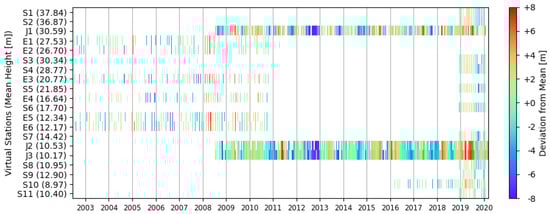 Table 2 shows the uncertainties of the resulting station elevations as a formal error from the linear adjustment. The uncertainties are largest for virtual stations of the Envisat mission and lowest for the Jason and Sentinel-3 missions.