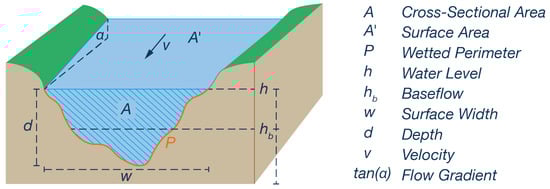 In this section, we describe the methodology used to estimate river discharge from remote sensing data at a given cross-section (CS) in detail. The methodology is similar to the AHG relations. Therefore, the fundamental equations to calculate discharge and flow velocity, described in Section 3.1, require the determination of the at-a-station hydrographic parameters shown in Figure 3. All parameters at a CS that are a function of stage are elements of the AHG [].