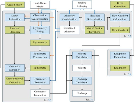 Next, we describe the estimation of the shown parameters, starting with the flow gradient which requires a linear adjustment of the satellite altimetry data (Section 3.2) to derive the elevation differences between the virtual stations. Additionally, the resulting elevations enable us to combine short-term satellite altimetry data from multiple virtual stations to one long-term time series. In Section 3.3, we estimate the geometric parameters by synchronizing the long-term water level time series with land-water masks to fit a hypsometric curve, construct a bathymetry, and extract the cross-sectional geometry. The hypsometry fitting requires the estimation of the river depth using empirically established width to depth relations. The estimation of the roughness coefficient using geomorphological adjustment factors is described in Section 3.4. Figure 4 shows a detailed flowchart of the explained approach with the processing steps and data grouped by the describing sections.